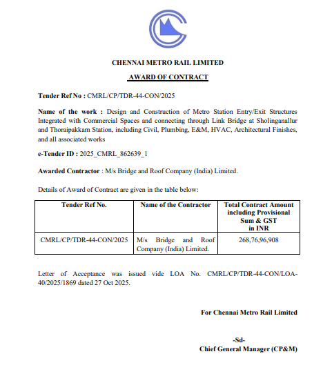 Contract’s Scope of Work: Design and Construction of Metro Station Entry/Exit Structures Integrated with Commercial Spaces and connecting through Link Bridge at Sholinganallur and Thoraipakkam Station, including Civil, Plumbing, E&M, HVAC, Architectural Finishes, and all associated works