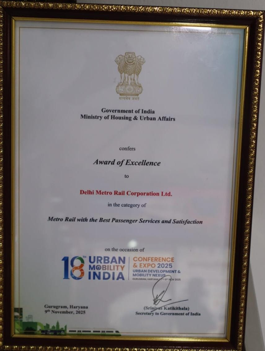 NEW DELHI (Metro Rail News): The Delhi Metro Rail Corporation (DMRC) has been honoured with the prestigious Award of Excellence in the category of “Metro Rail with the Best Passenger Services and Satisfaction” at the 18th Urban Mobility India (UMI) Conference & Expo 2025. The three-day event was held in Gurugram from November 7 to 9, 2025.