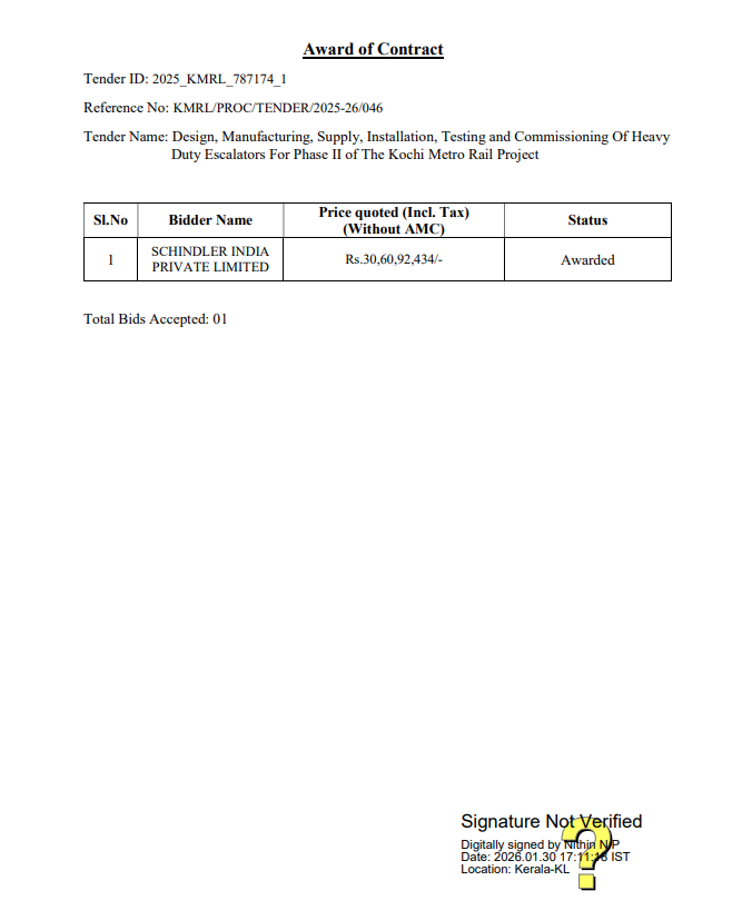 KMRL invited bids for this contract with a 730 days deadline. Technical bids for the contract were opened on 29 Sep 2025 announcing that 3 firms have submitted bids for the contract. Technical evaluation of the bids took place on 27 Nov 2025 and all the 3 firms qualified.Later on, financial bids were opened for the contract. Financial evaluation of the bids occurred on 30 Jan 2026 and Schindler India Private Limited was declared as the lowest bidder for the contract and received LoA for the contract.