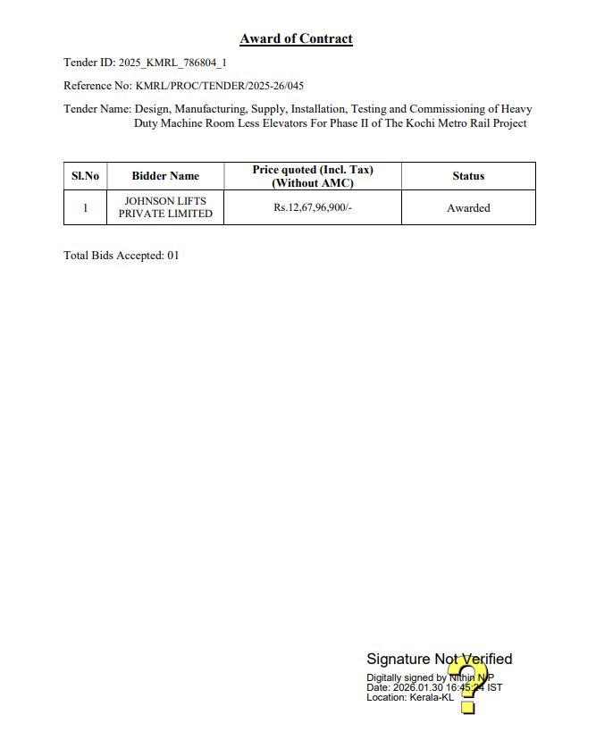 KMRL invited bids for this contract. Technical bids were opened on 29 Sep 2025 revealing that 2 firms have submitted bids for the contract. Technical evaluation of the submitted bids occurred on 27 Nov 2025 and both the firms qualified in that round. Subsequently, financial bids for the contract were opened and on 30 Jan 2026, the financial evaluation of the bids occurred. After the financial evaluation round KMRL announced Johnson Lifts Private Limited as the lowest bidder for the contract and received LoA for the same.