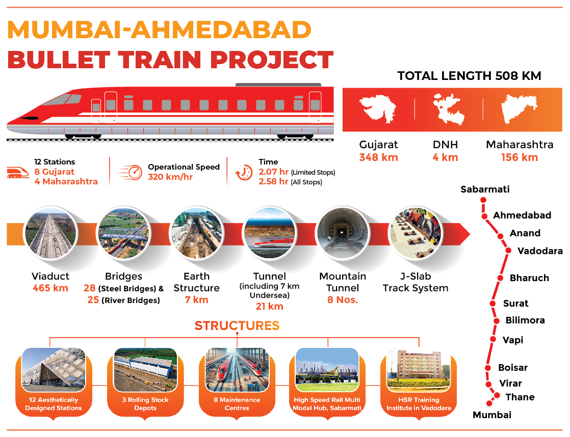 India is entering a new phase of urban and regional mobility with the launch of the country’s first Bullet Train Project the Mumbai–Ahmedabad High-Speed Rail (MAHSR) corridor. The MAHSR corridor will span 508 km and connect Mumbai in Maharashtra with Ahmedabad in Gujarat. The corridor is designed for an operating speed of 320 km/h, and it will reduce travel time while strengthening economic linkages between key cities such as Mumbai, Vapi, Surat, Anand, Vadodara, and Ahmedabad. The project, being developed at an estimated cost of ₹1,08,000 crore (USD 17 billion). Its initial section is going to be operational by August 2026.