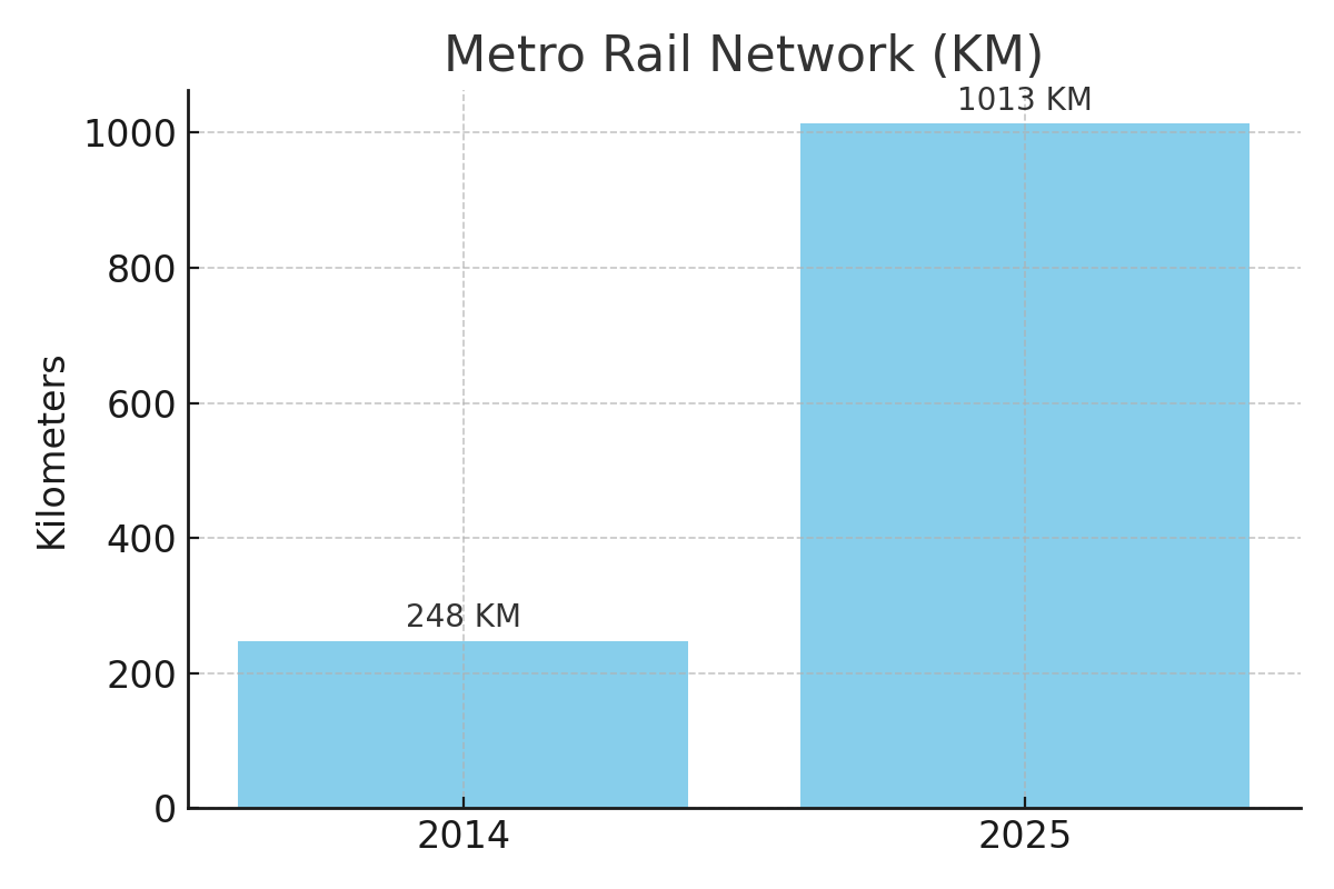 The annual metro budget for 2025–26 has been allocated at ₹34,807 crore, more than six times higher than ₹5,798 crore in 2013–14.