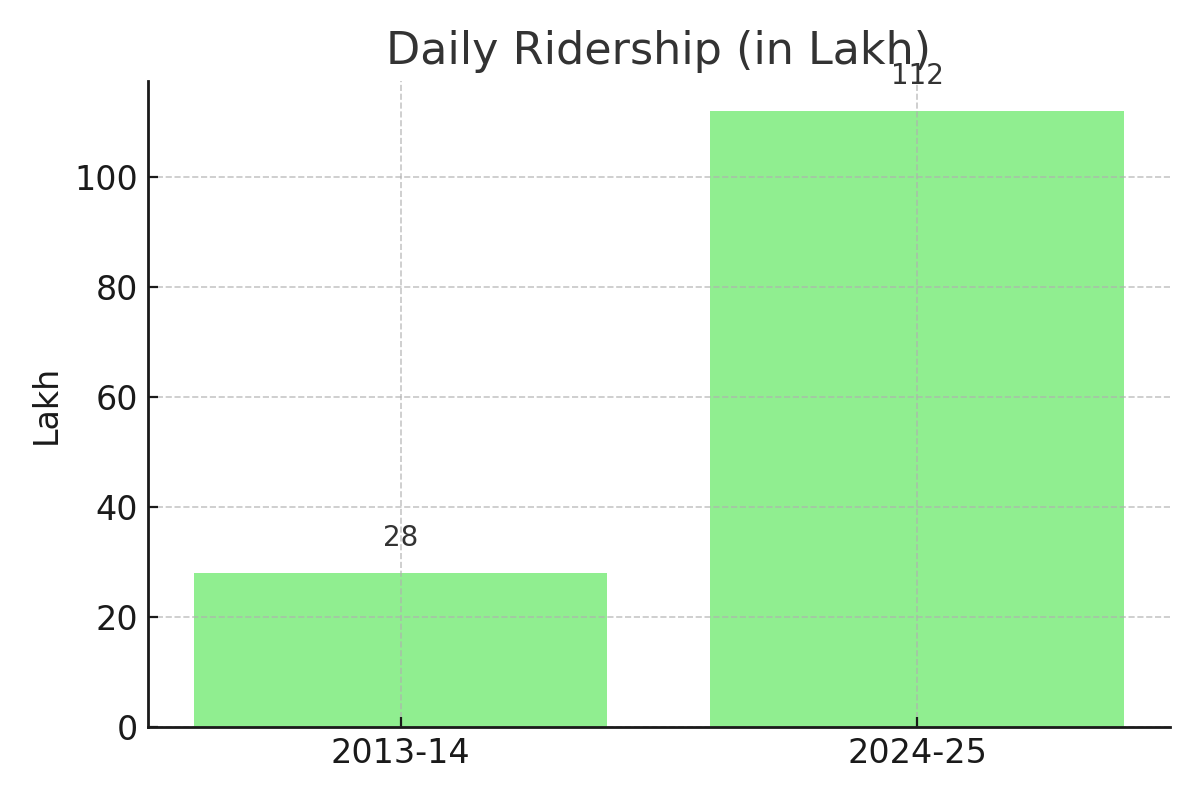 Average daily ridership has increased from about 28 lakh in 2013–14 to more than 1.12 crore by 2025, reflecting the growing role of metro systems in daily urban travel.