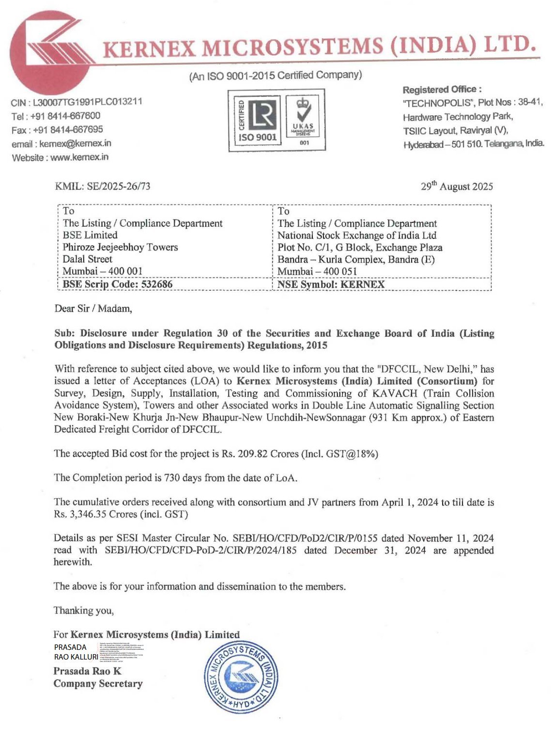 Kernex Microsystems (India) Ltd has received a Letter of Acceptance ( LoA) from the Dedicated Freight Corridor Corporation of India Ltd (DFCCIL) for the Kavach contract worth ₹209.82 crore. The contract includes the survey, design, supply, installation, testing and commissioning of the KAVACH System along the Eastern Dedicated Freight Corridor (EDFC).