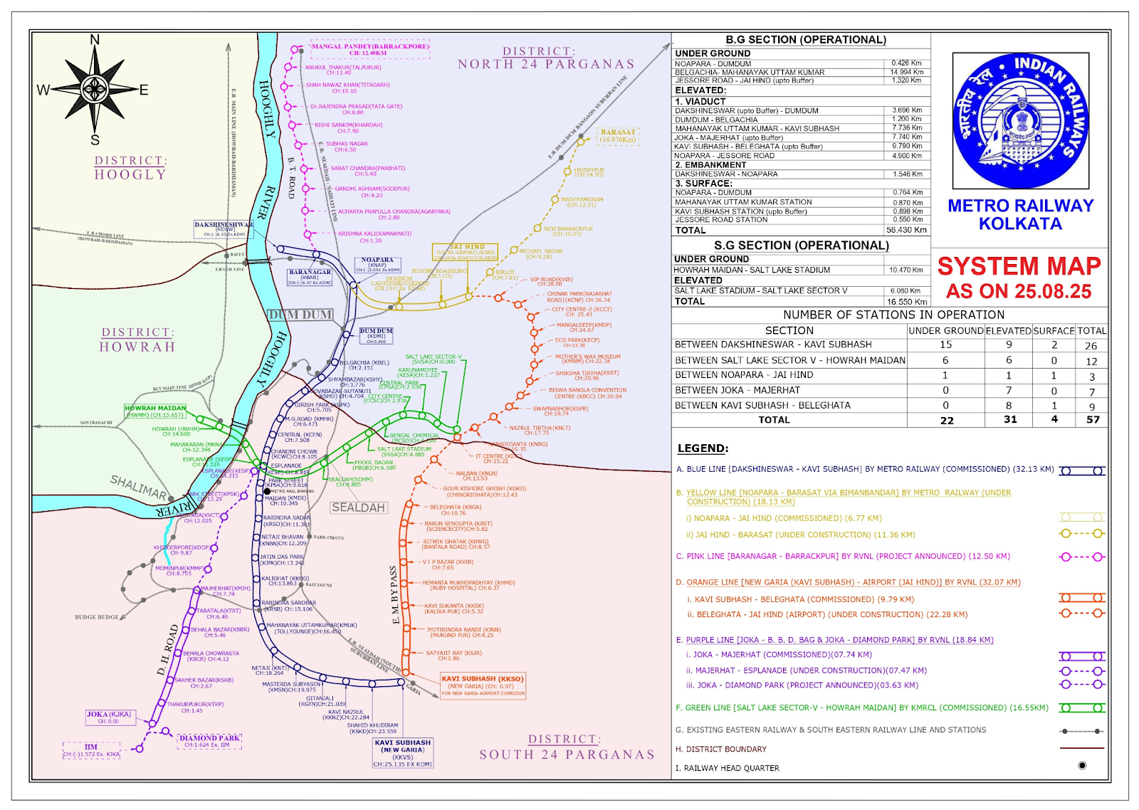 - Station Names: Howrah Maidan, Howrah, Mahakaran, Esplanade, Sealdah, Phoolbagan, Salt Lake Stadium, Bengal Chemical, City Centre, Central Park, Karunamoyee, Salt Lake Sector V