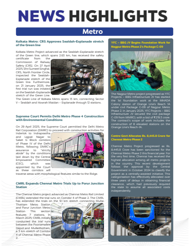 NEWS HIGHLIGHTSMetroKolkata Metro: CRS Approves Sealdah-Esplanade stretch of the Green lineKolkata Metro Project advanced as the Sealdah-Esplanade stretch of the Green line, which spans 2.63 km, has received the safety certificate from the Commission of Railway Safety (CRS). On 27 April 2025, Shri Sumeet Singhal, CRS, North Frontier Circle, inspected the SealdahEsplanade stretch of the Green line. Furthermore, on 21 January 2025, the first trial run was initated on the Sealdah-Esplanade stretch of the Green Line. The Green Line of Kolkata Metro spans 13 km, connecting Sector V %u2013 Sealdah and Howrah Maidan %u2013 Esplanade through 12 stations. Supreme Court Permits Delhi Metro Phase 4 Construction with Environmental ConditionsOn 29 April 2025, the Supreme Court permitted the Delhi Metro Rail Corporation (DMRC) to proceed with construction activities for Inderlok to Indraprastha and Lajpat Nagar to Saket G Block corridors of Phase IV of the Delhi Metro, following DMRC%u2019s assurance to %u201cstrictly abide%u201d by the conditions laid down by the Central Empowered Committee (CEC), which was appointed by the Court as these corridors will traverse areas with morphological features similar to the Ridge. CMRL Expands Chennai Metro Trials Up to Porur Junction StationThe Chennai Metro project advanced as Chennai Metro Rail Limited (CMRL) extended the trial runs on Corridor 4 of Phase 2. The CMRL has extended the trials on the 9.1 km stretch connecting Mullai Thottam Metro Station and Porur Junction Metro Station This section features 7 stations. In March 2025, CMRL initially conducted the trial runs between the Poonamallee Depot and Mullaithottam, a 3 km stretch of Corridor 4 of Chennai Metro Phase 2. YFC %u2013 BBG JV Begins Foundation Work for Nagpur Metro Phase 2%u2019s Package C-09The Nagpur Metro project progressed as YFC Projects %u2013 BBG Infrastructure JV has started the 1st foundation work at the MHADA Colony station of Orange Line%u2019s Reach 1A under civil Package C-09 of Nagpur Metro Phase 2. In January 2025, YFC Projects %u2013 BBG Infrastructure JV secured the civil package C-09 from MMRCL with a bid of %u20b9219.3 crore. The contract%u2019s scope of work includes the construction of 8 elevated stations on the Orange Line%u2019s Reach-1A.Centre Govt Allocates Rs. 8,445.8 Crore for Chennai Metro Phase 2Chennai Metro Project progressed as Rs. 8,445.8 Crore has been sanctioned for the Chennai Metro Phase 2 this financial year. For the very first time, Chennai has received the highest allocation among all metro projects in the country. This recent development follows the approval by the Central Government in October 2024 to classify the project as a centrally-assisted initiative. This categorisation has effectively alleviated over three years of delays in obtaining financial clearance, which had previously required the state to assume all associated costs independently.