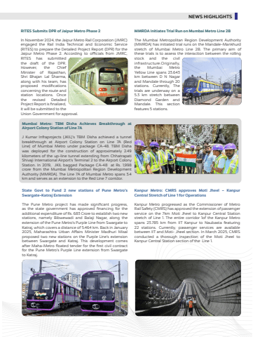 State Govt to Fund 2 new stations of Pune Metro%u2019s Swargate-Katraj Extension The Pune Metro project has made significant progress, as the state government has approved financing for the additional expenditure of Rs. 683 Crore to establish two new stations, namely Bibwewadi and Balaji Nagar, along the extension of the Pune Metro's Purple Line from Swargate to Katraj, which covers a distance of 5.464 km. Back in January 2025, Maharashtra Urban Affairs Minister Madhuri Misal proposed two new stations on the Purple Line%u2019s extension between Swargate and Katraj. This development comes after Maha-Metro floated tender for the first civil contract for the Pune Metro%u2019s Purple Line extension from Swargate to Katraj. Kanpur Metro: CMRS approves Moti Jheel %u2013 Kanpur Central Stretch of Line 1 for OperationsKanpur Metro progressed as the Commissioner of Metro Rail Safety (CMRS) has approved the extension of passenger service on the 7km Moti Jheel to Kanpur Central Station stretch of Line 1. The entire corridor 1of the Kanpur Metro spans 23.785 km from IIT Kanpur to Naubasta featuring 22 stations. Currently, passenger services are available between IIT and Moti- Jheel section. In March 2025, CMRS conducted a thorough inspection of the Moti Jheel to Kanpur Central Station section of the Line 1.RITES Submits DPR of Jaipur Metro Phase 2In November 2024, the Jaipur Metro Rail Corporation (JMRC) engaged the Rail India Technical and Economic Service (RITES) to prepare the Detailed Project Report (DPR) for the Jaipur Metro Phase 2. According to officials from JMRC, RITES has submitted the draft of the DPR. However, the Chief Minister of Rajasthan, Shri Bhajan Lal Sharma, along with his team, has proposed modifications concerning the route and station locations. Once the revised Detailed Project Report is finalized, it will be submitted to the Union Government for approval.MMRDA Initiates Trial Run on Mumbai Metro Line 2BThe Mumbai Metropolitan Region Development Authority (MMRDA) has initiated trial runs on the Mandale-Mankhurd stretch of Mumbai Metro Line 2B. The primary aim of these trials is to assess the interaction between the rolling stock and the civil infrastructure.Originally, the Mumbai Metro Yellow Line spans 23.643 km between D N Nagar and Mandale through 20 stations. Currently, The trials are underway on a 5.3 km stretch between Diamond Garden and Mandale. This section features 5 stations.Mumbai Metro: TBM Disha Achieves Breakthrough at Airport Colony Station of Line 7AJ Kumar Infraprojects (JKIL)%u2019s TBM Disha achieved a tunnel breakthrough at Airport Colony Station on Line 7A (Red Line) of Mumbai Metro under package CA-48. TBM Disha was deployed for the construction of approximately 2.49 kilometers of the up-line tunnel extending from Chhatrapati Shivaji International Airport%u2019s Terminal 2 to the Airport Colony Station. In 2019, JKIL bagged Package CA-48 at Rs. 1,998 crore from the Mumbai Metropolitan Region Development Authority (MMRDA). The Line 7A of Mumbai Metro spans 3.4 km and serves as an extension to the Red Line 7 corridor. NEWS HIGHLIGHTS