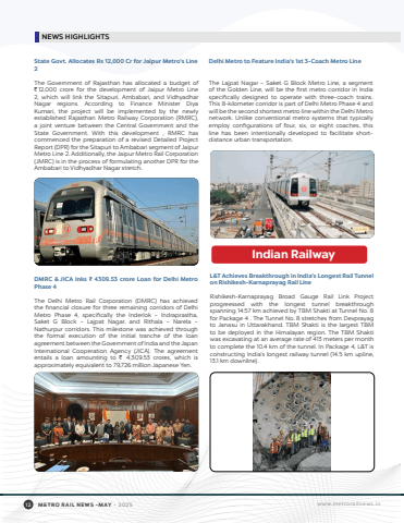 12METRO RAIL NEWS -MAY - 2025 www.metrorailnews.in State Govt. Allocates Rs 12,000 Cr for Jaipur Metro%u2019s Line 2The Government of Rajasthan has allocated a budget of `12,000 crore for the development of Jaipur Metro Line 2, which will link the Sitapuri, Ambabari, and Vidhyadhar Nagar regions. According to Finance Minister Diya Kumari, the project will be implemented by the newly established Rajasthan Metro Railway Corporation (RMRC), a joint venture between the Central Government and the State Government. With this development , RMRC has commenced the preparation of a revised Detailed Project Report (DPR) for the Sitapuri to Ambabari segment of Jaipur Metro Line 2. Additionally, the Jaipur Metro Rail Corporation (JMRC) is in the process of formulating another DPR for the Ambabari to Vidhyadhar Nagar stretch.DMRC & JICA Inks %u20b9 4309.53 crore Loan for Delhi Metro Phase 4The Delhi Metro Rail Corporation (DMRC) has achieved the financial closure for three remaining corridors of Delhi Metro Phase 4, specifically the Inderlok %u2013 Indraprastha, Saket G Block %u2013 Lajpat Nagar, and Rithala %u2013 Narela %u2013 Nathurpur corridors. This milestone was achieved through the formal execution of the initial tranche of the loan agreement between the Government of India and the Japan International Cooperation Agency (JICA). The agreement entails a loan amounting to ` 4,309.53 crores, which is approximately equivalent to 79,726 million Japanese Yen.L&T Achieves Breakthrough in India%u2019s Longest Rail Tunnel on Rishikesh-Karnaprayag Rail LineRishikesh-Karnaprayag Broad Gauge Rail Link Project progreessed with the longest tunnel breakthrough spanning 14.57 km achieved by TBM Shakti at Tunnel No. 8 for Package 4 . The Tunnel No. 8 stretches from Devprayag to Janasu in Uttarakhand. TBM Shakti is the largest TBM to be deployed in the Himalayan region. The TBM Shakti was excavating at an average rate of 413 meters per month to complete the 10.4 km of the tunnel. In Package 4, L&T is constructing India%u2019s longest railway tunnel (14.5 km upline, 13.1 km downline). Delhi Metro to Feature India%u2019s 1st 3-Coach Metro LineThe Lajpat Nagar %u2013 Saket G Block Metro Line, a segment of the Golden Line, will be the first metro corridor in India specifically designed to operate with three-coach trains. This 8-kilometer corridor is part of Delhi Metro Phase 4 and will be the second shortest metro line within the Delhi Metro network. Unlike conventional metro systems that typically employ configurations of four, six, or eight coaches, this line has been intentionally developed to facilitate shortdistance urban transportation.NEWS HIGHLIGHTSIndian Railway