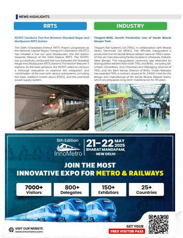 RRTSINDUSTRY NCRTC Conducts Trial Run Between Shatabdi Nagar and Modipuram RRTS StationThe Delhi-Ghaziabad-Meerut RRTS Project progressed as the National Capital Region Transport Corporation (NCRTC) has initiated a trial run upto Modipuram, the last station (towards Meerut) of the Delhi-Meerut RRTS. The NCRTC has successfully conducted trial runs between the Shatabdi Nagar and Modipuram RRTS stations.This section features 3 stations. As the trials advance, the NCRTC plans to conduct a thorough evaluation to examine the integration and coordination of the train with various subsystems, including the track, platform screen doors (PSDS), and the overhead power supply system.Industry Titagarh-BHEL Unveils Production Line of Vande Bharat Sleeper TrainTitagarh Rail Systems Ltd (TRSL), in collaboration with Bharat Heavy Electricals Ltd (BHEL), has officially inaugurated a production line for Vande Bharat sleeper trains at TRSL%u2019s stateof-the-art manufacturing facility located in Uttarpara, Kolkata, West Bengal. The inauguration ceremony was attended by distinguished leaders from both TRSL and BHEL, including Mr. Umesh Chowdhary, Vice Chairman and Managing Director of TRSL, and Ms. Bani Varma, Director of BHEL. Indian Railways has awarded TRSL a contract valued at Rs. 24000 crore for the design and manufacture of 80 Vande Bharat Sleeper Trains, which encompasses long-term maintenance for 35 years.. NEWS HIGHLIGHTS5th Edition21-22BHARAT MANDAPAM,NEW DELHIMAY2025JOIN THE MOSTINNOVATIVE EXPO FORMETRO & RAILWAYSGET YOURwww.innometro.comFREE VISITOR PASSVISIT OUR WEBSITE7000+Visitors 800+Delegates 150+Exhibitors25+Countries