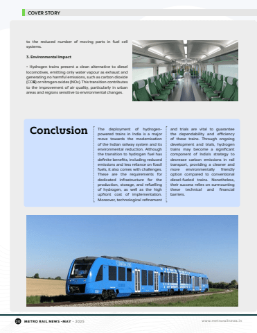 20METRO RAIL NEWS -MAY - 2025 www.metrorailnews.in to the reduced number of moving parts in fuel cell systems. 3. Environmental Impact%u2022 Hydrogen trains present a clean alternative to diesel locomotives, emitting only water vapour as exhaust and generating no harmful emissions, such as carbon dioxide (CO%u2082) or nitrogen oxides (NOx). This transition contributes to the improvement of air quality, particularly in urban areas and regions sensitive to environmental changes. The deployment of hydrogenpowered trains in India is a major move towards the modernisation of the Indian railway system and its environmental reduction. Although the transition to hydrogen fuel has definite benefits, including reduced emissions and less reliance on fossil fuels, it also comes with challenges. These are the requirements for dedicated infrastructure for the production, storage, and refuelling of hydrogen, as well as the high upfront cost of implementation. Moreover, technological refinement and trials are vital to guarantee the dependability and efficiency of these trains. Through ongoing development and trials, hydrogen trains may become a significant component of India's strategy to decrease carbon emissions in rail transport, providing a cleaner and more environmentally friendly option compared to conventional diesel-fueled trains. Nonetheless, their success relies on surmounting these technical and financial barriers.ConclusionCOVER STORY
