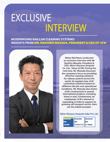 EXCLUSIVEINTERVIEWModernising Railcar Cleaning Systems: Insights from Mr. Naohiro Masuda, CEO of JCWMetro Rail News conducted an exclusive interview with Mr Naohiro Masuda, President & CEO, Nihon Sharyou Sejouki Co. Ltd., Tokyo (JCW). During the interview, Mr. Masuda discusses the company%u2019s focus on providing effective cleaning solutions for railway systems across the world. He explains how JCW customises solutions based on different climatic and operational conditions. Mr. Masuda also shares JCW%u2019s involvement in several international projects, including those in Asia. Furthermore, he emphasises JCW%u2019s interest in expanding in India to support its growing rail transport sector. Here are the edited excerpts.Metro Rail News conducted an exclusive interview with Mr Naohiro Masuda, President & CEO, Nihon Sharyou Senjouki Co. Ltd., Tokyo (JCW). During the interview, Mr. Masuda discusses the company%u2019s focus on providing effective cleaning solutions for railway systems across the world. He explains how JCW customises solutions based on different climatic and operational conditions. Mr. Masuda also shares JCW%u2019s involvement in several international projects, including those in Asia. Furthermore, he emphasises JCW%u2019s interest in expanding in India to support its growing rail transport sector. Here are the edited excerpts.MODERNISING RAILCAR CLEANING SYSTEMS: INSIGHTS FROM MR. NAOHIRO MASUDA, PRESIDENT & CEO OF JCWEXCLUSIVEINTERVIEW