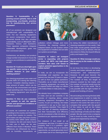 EXCLUSIVE INTERVIEWQuestion 9. Sustainability is a growing concern globally. How is JCW incorporating eco-friendly practices into its manufacturing and service processes?All of our products are designed and manufactured with sustainability in mind. For our cleaning equipment, we source components from worldrenowned brands that also prioritise sustainability, such as Mitsubishi, SMC, Panasonic, Omron, and Sumitomo. These Japanese companies integrate sustainable development goals into their core brand values.Furthermore, we develop and produce a large number of products in-house. By doing so, we contribute to sustainability as well. Question 10. Could you shed light upon any specific water-saving or energyefficient features in your railcar washing systems?Our cleaning equipment uses water and recycles 100% of it during the cleaning process. Complete cleaning requires a large amount of water, which can be harmful to the environment and result in high operating costs. That is why all of our cleaning equipment uses recycled water only.Question 11. How do you customise your systems to suit the specific climatic and operational conditions of different countries?Of course, we customise our systems according to the country and the place. It varies from country to country. The dirt & stains can also vary from country to country even within same country. For instance, the dirt and stains found on train cars in Delhi can be very different from those in Mumbai. These differences are influenced by factors such as humidity, temperature, air pollution, vehicle mileage, and more. Therefore, the cleaning method is adapted based on the location where the equipment is installed, and we tailor our systems accordingly.Question 12. India%u2019s rail transport sector is expanding with projects in metro rail, RRTS, and high-speed corridors. How does JCW intend to explore potential opportunities in the Indian market?In India, we aim to incorporate the knowledge and expertise we have gained over the past 70 years in Japan, as well as from our global operations. Thereafter, as an Indian manufacturer of cleaning equipment, we would like to expand further and align our efforts with India's Make in India policy too.We already have a subsidiary company in India, and we are currently in the process of inquiring about various cleaning equipment throughout the country. As per our findings, the Indian equipment is not up to the mark by the Japanese standard. They might fit into the look of cleaning equipment, but their functionality and efficiency can be considered a little bit below the standard as per Japanese standards.For instance, if we install an air conditioner and then if it doesn't work properly, then it is a problem, right? Rather than seeing this as a business opportunity, we would genuinely love if India makes use of our cleaning devices. So being the oldest manufacturer of cleaning equipment in the world, I feel that India would greatly benefit from our company and our devices. And we also intend to follow the Swachh Bharat policy and respect that.Question 13. What message would you like to convey to the readers of Metro Rail News?As we know that India is a developing country and Indian railroads are under development and redevelopment. However, it will soon become the world's largest railroad powerhouse. The number of lines, the length of distance covered by the tracks, and the number of coaches would soon be the number one in the world. This is only possible with the right number of people and funding, of course.We are looking into having the best skills and experiences in order to make the Indian railway system the best railroad network in the world. We want to be a company that grows with the growth of the nation as well as the Indian railway system. To do so, we need many teachings of India and the Indian people. We also want to be a company that is loved by India, loved by Indian people and respected by everyone.