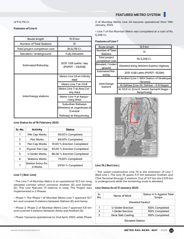 www.metrorailnews.in METRO RAIL NEWS -MAY - 2025 29of %u20b9 6,716 Cr.Features of Line 6 Line Status As of 18 February 2025Line 7 ( Red Line) %u2022 The Line 7 of Mumbai Metro is an operational 16.5 km long elevated corridor which connects Andheri (E) and Dahisar (E). This Line features 13 stations in total. The Project was implemented in 2 Phases. %u2022 Phase 1: The Phase 1 of Mumbai Metro Line 7 spanned 10.7 km and covered 9 stations between Dahisar (E) and Aarey.%u2022 Phase 2: Phase 2 of Mumbai Metro Line 7 spanned 5.8 km and covered 4 stations between Aarey and Andheri (E). %u2022 Phase 1 became operational on 2nd April, 2022, while Phase 2 of Mumbai Metro Line 2A became operational from 19th January, 2023.%u2022 Line 7 of the Mumbai Metro was completed at a cost of Rs. 6,208 Cr.Features of Line 7 Line 7A ( Red Line ) %u2022 The under-construction Line 7A is the extension of Line 7 (Red Line ). The Line 7A spans 3.17 km between Andheri and CSIA Terminal through 2 stations. Out of 3.17 km the 2.915 km is underground while the remaining route is elevated. Line Status As of 31 January 2025Route length15.31 km Number of Total Stations13Total project completion costRs 6,716 Cr. Elevated / UndergroundFully ElevatedEstimated Ridership 2031: 7.69 Lakhs/ day (PHPDT %u2013 29,658)Interchange stations Metro Line 2A at Infinity MallMetro Line 7 at JVLRMetro Line 3 at Arey Colony AreaMetro Line 4 at Kanjurmarg WestSuburban Railways (Western) at Jogeshwari & (CentralRailway) at Kanjurmarg.Sr. No.ActivityStatus 1Pile Cap Works93.00% Completed 2Pier Works89.00% Completed 3Pier Cap Works91.00 % Erection Completed 4Flyover Pier Cap93.00 % Erection Completed 5U Girder Works86.00 % Erection Completed 6Stations Works73.60% Completed 7Station Entry-Exit Works29.50 % Completed Route length16.5 km Number of Total Stations13Total project completion costRs 6,208 Cr. Elevated / UndergroundElevated along Western Express HighwayEstimated Ridership 2031: 6.68 Lakhs (PHPDT- 18,584)Interchange stationsAt Andheri (Line 1: WEH Station of Ghatkopar - Versova)At Dahisar (Line 2A: Dahisar - D N Nagar)At JVLR Jn. (Line 6: Swami Samarth Nagar - Kanjurmarg)Sr. No.Name of WorkStatus in % Against Total ScopeElevated Viaduct1U-Girder Erection100% Completed2I-Girder Erection100% Completed3Deck Slab Casting100% Completed Elevated StationFEATURED METRO SYSTEM