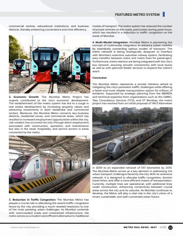 www.metrorailnews.in METRO RAIL NEWS -MAY - 2025 33commercial centres, educational institutions, and business districts, thereby enhancing convenience and time efficiency. 2. Economic Growth: The Mumbai Metro Project has majorly contributed to the city's economic development. The establishment of this metro system has led to a surge in real estate development by increasing property values and attracting investments in both residential and commercial sectors. Moreover, the Mumbai Metro connects key business districts, residential zones, and commercial areas, which has resulted in increased employment opportunities within the city. Job creation has occurred not only through direct employment associated with construction, operation, and maintenance but also in the retail, hospitality, and service sectors in areas connected by the metro. 3. Reduction in Traffic Congestion: The Mumbai Metro has played a crucial role in alleviating the severe traffic congestion faced by the city, providing a much-needed resolution to one of the most pressing urban challenges. As Mumbai contends with overcrowded roads and constrained infrastructure, the metro serves as a modern and efficient alternative to traditional modes of transport. The metro system has reduced the number of private vehicles on the roads, particularly during peak hours, which has resulted in a reduction in traffic congestion on the roads of Mumbai. 4. Multi-Modal Integration: Mumbai Metro is pioneering the concept of multimodal integration to enhance urban mobility by seamlessly connecting various modes of transport. The metro network is being strategically designed to interface with Mumbai%u2019s extensive suburban railway system, facilitating easy transfers between trains and metro lines for passengers. Furthermore, metro stations are being integrated with the city's bus network, ensuring smooth connectivity with local buses as well as with planned feeder services to expand the metro's reach.ConclusionThe Mumbai Metro represents a pivotal initiative aimed at mitigating the city%u2019s persistent traffic challenges while offering a faster and more reliable transportation option for millions of residents. Supported by strategic planning from the MMRDA and technical expertise from organisations such as the DMRC, Tata Consultancy Services (TCS), and IIT Bombay, the metro project has evolved from an initial proposal of 146.5 kilometres in 2004 to an expanded network of 337 kilometres by 2019. The Mumbai Metro serves as a key element in addressing the urban transport challenges faced by the city. With its extensive network, it is designed to alleviate traffic congestion, shorten travel times, and offer a more efficient means of transportation. Currently, multiple lines are operational, with additional lines under construction, enhancing connectivity between crucial areas across the city and its suburbs. As Mumbai continues to develop, the Metro will play a vital role in the city%u2019s vision of a smart, sustainable, and well-connected urban future.FEATURED METRO SYSTEM