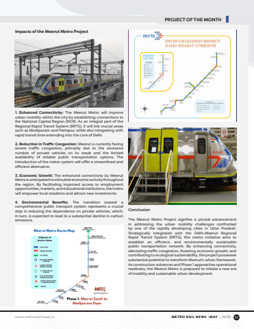 www.metrorailnews.in METRO RAIL NEWS -MAY - 2025 37Impacts of the Meerut Metro Project 1. Enhanced Connectivity: The Meerut Metro will improve urban mobility within the city by establishing connections to the National Capital Region (NCR). As an integral part of the Regional Rapid Transit System (RRTS), it will link crucial areas such as Modipuram and Partapur, while also integrating with rapid transit lines extending into the core of Delhi. 2. Reduction in Traffic Congestion: Meerut is currently facing severe traffic congestion, primarily due to the excessive number of private vehicles on its roads and the limited availability of reliable public transportation options. The introduction of the metro system will offer a streamlined and efficient alternative.3. Economic Growth: The enhanced connectivity by Meerut Metro is anticipated to stimulate economic activity throughout the region. By facilitating improved access to employment opportunities, markets, and educational institutions, the metro will empower local residents and attract new investments.4. Environmental Benefits: The transition toward a comprehensive public transport system represents a crucial step in reducing the dependence on private vehicles, which, in turn, is expected to lead to a substantial decline in carbon emissions. ConclusionThe Meerut Metro Project signifies a pivotal advancement in addressing the urban mobility challenges confronted by one of the rapidly developing cities in Uttar Pradesh. Strategically integrated with the Delhi-Meerut Regional Rapid Transit System (RRTS), this metro initiative aims to establish an efficient, and environmentally sustainable public transportation network. By enhancing connectivity, alleviating traffic congestion, fostering economic growth, and contributing to ecological sustainability, the project possesses substantial potential to transform Meerut%u2019s urban framework. As construction advances and Phase 1 approaches operational readiness, the Meerut Metro is prepared to initiate a new era of mobility and sustainable urban development. PROJECT OF THE MONTH