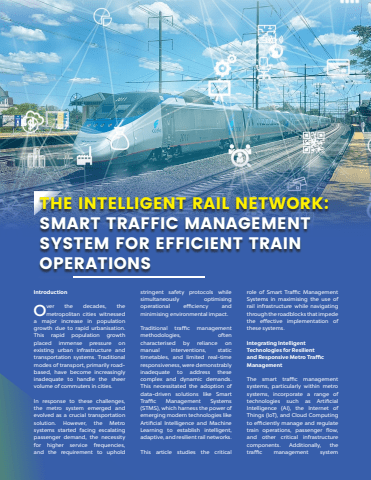 38METRO RAIL NEWS -MAY - 2025 www.metrorailnews.in THE INTELLIGENT RAIL NETWORK: SMART TRAFFIC MANAGEMENT SYSTEM FOR EFFICIENT TRAIN OPERATIONS IntroductionOver the decades, the metropolitan cities witnessed a major increase in population growth due to rapid urbanisation. This rapid population growth placed immense pressure on existing urban infrastructure and transportation systems. Traditional modes of transport, primarily roadbased, have become increasingly inadequate to handle the sheer volume of commuters in cities. In response to these challenges, the metro system emerged and evolved as a crucial transportation solution. However, the Metro systems started facing escalating passenger demand, the necessity for higher service frequencies, and the requirement to uphold stringent safety protocols while simultaneously optimising operational efficiency and minimising environmental impact. Traditional traffic management methodologies, often characterised by reliance on manual interventions, static timetables, and limited real-time responsiveness, were demonstrably inadequate to address these complex and dynamic demands. This necessitated the adoption of data-driven solutions like Smart Traffic Management Systems (STMS), which harness the power of emerging modern technologies like Artificial Intelligence and Machine Learning to establish intelligent, adaptive, and resilient rail networks. This article studies the critical role of Smart Traffic Management Systems in maximising the use of rail infrastructure while navigating through the roadblocks that impede the effective implementation of these systems.Integrating Intelligent Technologies for Resilient and Responsive Metro Traffic ManagementThe smart traffic management systems, particularly within metro systems, incorporate a range of technologies such as Artificial Intelligence (AI), the Internet of Things (IoT), and Cloud Computing to efficiently manage and regulate train operations, passenger flow, and other critical infrastructure components. Additionally, the traffic management system