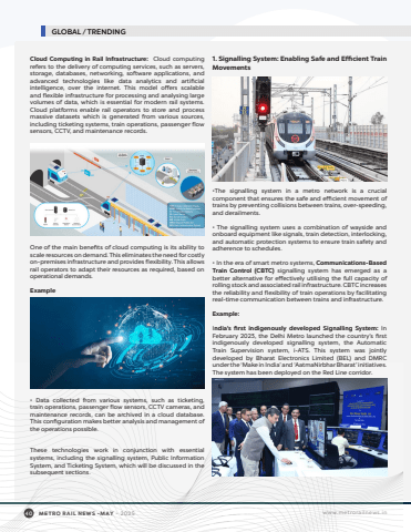40METRO RAIL NEWS -MAY - 2025 www.metrorailnews.in Cloud Computing in Rail Infrastructure: Cloud computing refers to the delivery of computing services, such as servers, storage, databases, networking, software applications, and advanced technologies like data analytics and artificial intelligence, over the internet. This model offers scalable and flexible infrastructure for processing and analysing large volumes of data, which is essential for modern rail systems. Cloud platforms enable rail operators to store and process massive datasets which is generated from various sources, including ticketing systems, train operations, passenger flow sensors, CCTV, and maintenance records.One of the main benefits of cloud computing is its ability to scale resources on demand. This eliminates the need for costly on-premises infrastructure and provides flexibility. This allows rail operators to adapt their resources as required, based on operational demands.Example%u2022 Data collected from various systems, such as ticketing, train operations, passenger flow sensors, CCTV cameras, and maintenance records, can be archived in a cloud database. This configuration makes better analysis and management of the operations possible.These technologies work in conjunction with essential systems, including the signalling system, Public Information System, and Ticketing System, which will be discussed in the subsequent sections.1. Signalling System: Enabling Safe and Efficient Train Movements%u2022The signalling system in a metro network is a crucial component that ensures the safe and efficient movement of trains by preventing collisions between trains, over-speeding, and derailments. %u2022 The signalling system uses a combination of wayside and onboard equipment like signals, train detection, interlocking, and automatic protection systems to ensure train safety and adherence to schedules.%u2022 In the era of smart metro systems, Communications-Based Train Control (CBTC) signalling system has emerged as a better alternative for effectively utilising the full capacity of rolling stock and associated rail infrastructure. CBTC increases the reliability and flexibility of train operations by facilitating real-time communication between trains and infrastructure.Example:India's first indigenously developed Signalling System: In February 2023, the Delhi Metro launched the country%u2019s first indigenously developed signalling system, the Automatic Train Supervision system, i-ATS. This system was jointly developed by Bharat Electronics Limited (BEL) and DMRC under the %u2018Make in India%u2019 and %u2018AatmaNirbhar Bharat%u2019 initiatives. The system has been deployed on the Red Line corridor. GLOBAL / TRENDING