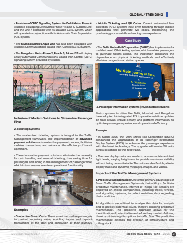 www.metrorailnews.in METRO RAIL NEWS -MAY - 2025 41%u2022Provision of CBTC Signalling System for Delhi Metro Phase 4:Alstom is equipping Delhi Metro Phase 4%u2019s Line 10 (Golden Line) and the Line 7 extension with its scalable CBTC system, which will operate in conjunction with its Automatic Train Supervision (ATS) system.%u2022 The Mumbai Metro%u2019s Aqua Line has also been equipped with Alstom%u2019s Communications-Based Train Control (CBTC) System. %u2022 The Bengaluru Metro Phase 2, Reach 6, 2A and 2B will deploy a fully automated Communications-Based Train Control (CBTC) signalling system provided by Alstom.Inclusion of Modern Solutions to Streamline Passenger Flow 2. Ticketing Systems%u2022 The modernised ticketing system is integral to the Traffic Management framework. The implementation of advanced payment solutions automates the payment process, facilitates cashless transactions, and enhances the efficiency of transit operations. %u2022 These innovative payment solutions eliminate the necessity for cash handling and manual ticketing, thus saving time for passengers and aiding in the management of passenger flow, which in turn ensures seamless operational functionality.Examples%u2022 Contactless Smart Cards: These smart cards allow passengers to preload monetary value, enabling tap-in and tap-out transactions at the start and conclusion of their journeys.%u2022Mobile Ticketing and QR Codes: Current automated fare collection (AFC) systems now offer ticketing through mobile applications that generate QR codes, streamlining the purchasing process while enhancing user experience.Case Study%u2022 The Delhi Metro Rail Corporation (DMRC) has implemented a mobile-based QR-ticketing system, which enables passengers to purchase tickets online. This innovation diminishes the dependence on physical ticketing methods and effectively alleviates congestion at station queues. 3. Passenger Information Systems (PIS) in Metro NetworksMetro systems in cities like Delhi, Mumbai, and Bengaluru have adopted Iot-integrated PIS to provide real-time updates on train arrivals, crowd density, and platform information, to optimise passenger experience and operational efficiency.Example:%u2022 In March 2025, the Delhi Metro Rail Corporation (DMRC) announced the upgradation of its Passenger Information Display System (PIDS) to enhance the passenger experience with the latest technology. The upgrade will involve 110 units across 18 stations on the Yellow Line. %u2022 The new display units are made to accommodate ambient light levels, varying brightness to provide maximum visibility without being uncomfortable. The units are also flexible, able to display static and dynamic messages, images, and videos.Impacts of the Traffic Management Systems1. Predictive Maintenance: One of the primary advantages of Smart Traffic Management Systems is their ability to facilitate predictive maintenance. Internet of Things (IoT) sensors are deployed on critical components, including tracks, wheels, and signalling systems, to collect real-time data regarding their condition.AI algorithms are utilised to analyse this data for analysis and to predict potential issues, thereby enabling predictive maintenance.. This proactive approach allows for the identification of potential issues before they turn into failures, thereby minimising disruptions to traffic flow. The predictive maintenance extends the lifespan of infrastructure and rolling stock.GLOBAL / TRENDING