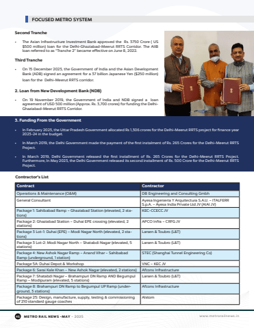 46METRO RAIL NEWS -MAY - 2025 www.metrorailnews.in Second Tranche%u2022The Asian Infrastructure Investment Bank approved the Rs. 3750 Crore ( US $500 million) loan for the Delhi-Ghaziabad-Meerut RRTS Corridor. The AIIB loan referred to as %u201cTranche 2%u201d became effective on June 8, 2022. Third Tranche %u2022On 15 December 2023, the Government of India and the Asian Development Bank (ADB) signed an agreement for a 37 billion Japanese Yen ($250 million) loan for the Delhi-Meerut RRTS corridor.2. Loan from New Development Bank (NDB) %u2022On 19 November 2019, the Government of India and NDB signed a loan agreement of USD 500 million (Approx. Rs. 3,700 crores) for funding the DelhiGhaziabad-Meerut RRTS Corridor.3. Funding From the Government %u2022In February 2023, the Uttar Pradesh Government allocated Rs 1,306 crores for the Delhi-Meerut RRTS project for finance year 2023-24 in the budget. %u2022In March 2019, the Delhi Government made the payment of the first instalment of Rs. 265 Crores for the Delhi-Meerut RRTS Project. %u2022In March 2019, Delhi Government released the first installment of Rs. 265 Crores for the Delhi-Meerut RRTS Project. Furthermore, In May 2023, the Delhi Government released its second installment of Rs. 500 Crore for the Delhi-Meerut RRTS Project. ContractContractorOperations & Maintenance (O&M) DB Engineering and Consulting GmbhGeneral ConsultantAyesa lngenieria Y Arquitectura S.A.U. %u2013 ITALFERR S.p.A. %u2013 Ayesa India Private Ltd JV (AIAI JV)Package 1: Sahibabad Ramp %u2013 Ghaziabad Station (elevated, 2 stations)KEC-CCECC JVPackage 2: Ghaziabad Station %u2013 Duhai EPE crossing (elevated, 2 stations)APCO Infra %u2013 CRFG JVPackage 3 Lot-1: Duhai (EPE) %u2013 Modi Nagar North (elevated, 2 stations)Larsen & Toubro (L&T)Package 3 Lot-2: Modi Nagar North %u2013 Shatabdi Nagar (elevated, 5 stations)Larsen & Toubro (L&T)Package 4: New Ashok Nagar Ramp %u2013 Anand Vihar %u2013 Sahibabad Ramp (underground, 1 station)STEC (Shanghai Tunnel Engineering Co)Package 5A: Duhai Depot & WorkshopVNC %u2013 KEC JVPackage 6: Sarai Kale Khan %u2013 New Ashok Nagar (elevated, 2 stations)Afcons InfrastructurePackage 7: Shatabdi Nagar %u2013 Brahampuri DN Ramp AND Begumpul Ramp %u2013 Modipuram (elevated, 5 stations)Larsen & Toubro (L&T)Package 8: Brahampuri DN Ramp to Begumpul UP Ramp (underground, 3 stations)Afcons InfrastructurePackage 25: Design, manufacture, supply, testing & commissioning of 210 standard gauge coachesAlstom Contractor%u2019s List FOCUSED METRO SYSTEM