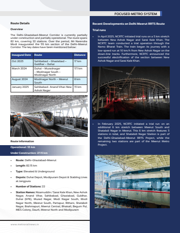 www.metrorailnews.in METRO RAIL NEWS -MAY - 2025 47Route Details Overview The Delhi-Ghaziabad-Meerut Corridor is currently partially under construction and partially operational. The route spans 82 km, covering 22 stations. Over the period, Mr Narendra Modi inaugurated the 55 km section of the Delhi-Meerut Corridor. The key dates have been mentioned beloRoute Information Operational: 55 km Under Construction: 27.15 km%u2022Route: Delhi-Ghaziabad-Meerut %u2022Length: 82.15 km%u2022Type: Elevated & Underground%u2022Depots: Duhai Depot, Modipuram Depot & Stabling Lines at Jangpura%u2022Number of Stations: 22%u2022Station Names: Nizamuddin / Sarai Kale Khan, New Ashok Nagar, Anand Vihar, Sahibabad, Ghaziabad, Guldhar, Duhai (EPE), Murad Nagar, Modi Nagar South, Modi Nagar North, Meerut South, Partapur, Rithani, Shatabdi Nagar, Brahmapuri, Meerut Central, Bhaisali, Begum Pul, MES Colony, Daurli, Meerut North and ModipuramRecent Developments on Delhi Meerut RRTS Route Trial runs %u2022In April 2025, NCRTC initiated trial runs on a 5 km stretch between New Ashok Nagar and Sarai Kale Khan. The NCRTC team conducted a trial operation through the Namo Bharat Train. The train began its journey with a low-speed run at 10 km/h from New Ashok Nagar on the down-line tracks. Furthermore, NCRTC announced the successful electrification of the section between New Ashok Nagar and Sarai Kale Khan.%u2022In February 2025, NCRTC initiated a trial run on an additional 6 km stretch between Meerut South and Shatabdi Nagar in Meerut. This 6 km stretch features 3 stations in total, and Shatabdi Nagar Station is part of the Delhi-Ghaziabad-Meerut RRTS Project, while the remaining two stations are part of the Meerut Metro Project.Inaugural DateRouteDistanceOct 2023Sahibabad %u2013 Ghaziabad %u2013 Guldhar %u2013 Duhai17 kmMarch 2024Duhai %u2013 Muradnagar %u2013 Modinagar South %u2013 Modinagar North17.1 kmAugust 2024Modinagar North %u2013 Meerut South8 kmJanuary 2025 Sahibabad- Anand Vihar-New Ashok Nagar 13 km FOCUSED METRO SYSTEM