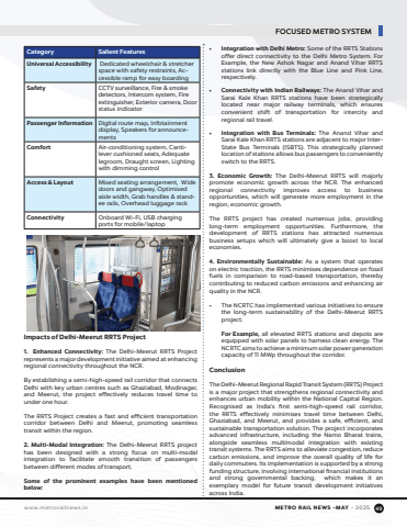 www.metrorailnews.in METRO RAIL NEWS -MAY - 2025 49CategorySalient FeaturesUniversal Accessibility Dedicated wheelchair & stretcher space with safety restraints, Accessible ramp for easy boardingSafetyCCTV surveillance, Fire & smoke detectors, Intercom system, Fire extinguisher, Exterior camera, Door status indicatorPassenger InformationDigital route map, Infotainment display, Speakers for announcementsComfortAir-conditioning system, Cantilever cushioned seats, Adequate legroom, Draught screen, Lighting with dimming controlAccess & LayoutMixed seating arrangement, Wide doors and gangway, Optimised aisle width, Grab handles & standee rails, Overhead luggage rackConnectivityOnboard Wi-Fi, USB charging ports for mobile/laptopImpacts of Delhi-Meerut RRTS Project 1. Enhanced Connectivity: The Delhi-Meerut RRTS Project represents a major development initiative aimed at enhancing regional connectivity throughout the NCR.By establishing a semi-high-speed rail corridor that connects Delhi with key urban centres such as Ghaziabad, Modinagar, and Meerut, the project effectively reduces travel time to under one hour. The RRTS Project creates a fast and efficient transportation corridor between Delhi and Meerut, promoting seamless transit within the region.2. Multi-Modal Integration: The Delhi-Meerut RRTS project has been designed with a strong focus on multi-modal integration to facilitate smooth transition of passengers between different modes of transport.Some of the prominent examples have been mentioned belo %u2022Integration with Delhi Metro: Some of the RRTS Stations offer direct connectivity to the Delhi Metro System. For Example, the New Ashok Nagar and Anand Vihar RRTS stations link directly with the Blue Line and Pink Line, respectively. %u2022Connectivity with Indian Railways: The Anand Vihar and Sarai Kale Khan RRTS stations have been strategically located near major railway terminals, which ensures convenient shift of transportation for intercity and regional rail travel.%u2022Integration with Bus Terminals: The Anand Vihar and Sarai Kale Khan RRTS stations are adjacent to major InterState Bus Terminals (ISBTS). This strategically planned location of stations allows bus passengers to conveniently switch to the RRTS. 3. Economic Growth: The Delhi-Meerut RRTS will majorly promote economic growth across the NCR. The enhanced regional connectivity improves access to business opportunities, which will generate more employment in the region, economic growth. The RRTS project has created numerous jobs, providing long-term employment opportunities. Furthermore, the development of RRTS stations has attracted numerous business setups which will ultimately give a boost to local economies. 4. Environmentally Sustainable: As a system that operates on electric traction, the RRTS minimises dependence on fossil fuels in comparison to road-based transportation, thereby contributing to reduced carbon emissions and enhancing air quality in the NCR. %u2022The NCRTC has implemented various initiatives to ensure the long-term sustainability of the Delhi-Meerut RRTS project.For Example, all elevated RRTS stations and depots are equipped with solar panels to harness clean energy. The NCRTC aims to achieve a minimum solar power generation capacity of 11 MWp throughout the corridor.ConclusionThe Delhi-Meerut Regional Rapid Transit System (RRTS) Project is a major project that strengthens regional connectivity and enhances urban mobility within the National Capital Region. Recognised as India%u2019s first semi-high-speed rail corridor, the RRTS effectively minimises travel time between Delhi, Ghaziabad, and Meerut, and provides a safe, efficient, and sustainable transportation solution. The project incorporates advanced infrastructure, including the Namo Bharat trains, alongside seamless multimodal integration with existing transit systems. The RRTS aims to alleviate congestion, reduce carbon emissions, and improve the overall quality of life for daily commuters. Its implementation is supported by a strong funding structure, involving international financial institutions and strong governmental backing, which makes it an exemplary model for future transit development initiatives across India.FOCUSED METRO SYSTEM