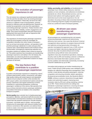 Safety, punctuality, and reliability are fundamental to passenger trust. Visible safety measures, real-time updates on train schedules, and adherence to timeliness standards are critical. Personalized services, such as tailored meal options and loyalty programs, add a distinctive touch to the travel experience. For rail operators, focusing on these interconnected elements is key to fostering long-term loyalty and positioning rail travel as a preferred mode of transport globally.The rail industry has undergone significant transformations over the past few decades, driven by evolving passenger needs and expectations. Historically, rail travel was often viewed as a utilitarian mode of transportation, primarily focused on e%u008fciency and cost-e%u0090ectiveness. However, as society has progressed, so too have the expectations surrounding passenger experience. Today's travelers seek a journey that o%u0090ers reliability, comfort, engagement, and safety. They expect transportation that goes beyond just getting them from point A to B, with an experience that enhances their overall travel. The importance of enhancing the passenger experience within the rail ecosystem cannot be overstated. As competition intensifies from other modes of transport%u2014such as air travel and private vehicles%u2014rail operators must prioritize passenger satisfaction to retain and grow their customer base. Quest Global stands at the forefront of this transformation, leveraging its engineering expertise and innovative solutions to redefine what it means to travel by rail. This article examines how innovations are transforming passenger experience and safety in the rail industry. Key stakeholders are advancing AI-driven personalization, sustainable practices, and collaborative solutions to shape the future of rail travel.The evolution of passenger experience in railA positive rail passenger experience is shaped by a blend of factors that prioritize comfort, convenience, and safety. High-quality seating with ample legroom and adjustable features ensures physical comfort, while amenities like Wi-Fi, power outlets, and entertainment options elevate the journey. Cleanliness and regular maintenance of trains contribute to a welcoming atmosphere, reinforcing passengers%u2019 confidence in the service. Rail operators that focus on these elements enhance passenger satisfaction and position themselves as leaders in the competitive transport ecosystem.Service quality plays a pivotal role in shaping passenger perceptions. Attentive, well-trained sta%u0090 who provide clear communication and responsive assistance can transform routine trips into pleasant experiences. Smooth ticketing processes%u2014via mobile apps or kiosks%u2014and accessible infrastructure for passengers with reduced mobility further enhance convenience. Rail operators can address these needs to create a more inclusive environment that caters to a diverse passenger base.The key factors that contribute to a positive rail passenger experienceAI technologies are revolutionizing the rail industry, enhancing passenger experiences while driving e%u008fciency and revenue. Use cases like AI-driven revenue management allow operators to analyze historical trends and optimize pricing dynamically. A European rail operator leveraging this approach saw a 3-8% revenue increase and higher ridership by aligning fares with demand. Security innovations (fraud and incivility prevention) using artificial vision and predictive algorithms have also streamlined operations, reducing security costs by 10% and boosting customer confidence. Real-time intermodal information systems provide journey updates and intermodal connectivity, increasing customer satisfaction by up to 15%1.Innovative pilot programs are further transforming rail travel. Thales Group%u2019s DIVA system uses intelligent video analytics for e%u0090ective Passenger flow management. They monitor crowd density and guide passengers, reducing congestion and ensuring smoother station operations. AI-powered personalization tools, like Deutsche Bahn%u2019s SEMMI, enhance customer interactions through digital avatars and automated support, improving issue resolution rates by 15% and cutting marketing costs by up to 15%1. These advancements are setting new standards in passenger experience, ensuring rail travel remains a preferred, innovative mode of transport.AI-driven use cases transforming railpassenger experiences
