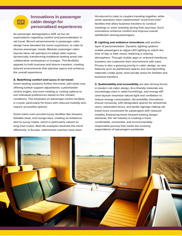 52METRO RAIL NEWS -MAY - 2025 www.metrorailnews.in introduced to cater to couples traveling together, while some operators have implemented %u201cwork-from-train%u201d facilities that allow business travelers to conduct meetings or work remotely during their journeys. Such innovations enhance comfort and improve overallsatisfaction among passengers.B. Lighting and ambiance innovations add another layer of personalization. Dynamic lighting systems enable passengers to adjust LED lighting to match the time of day or their mood, fostering a relaxing atmosphere. Through mobile apps or onboard interfaces, travelers can customize their environment with ease. Privacy is also a growing priority in cabin design, as new features such as partitioned spaces and soundproofing materials create quiet, semi-private areas for families and business travelers. C. Sustainability and accessibility are also driving forces in modern rail cabin design. Eco-friendly materials are increasingly used in cabin furnishings, and energy-e%u0080-cient layouts maximize natural light and ventilation to reduce energy consumption. Accessibility innovations ensure inclusivity, with designated spaces for wheelchair users, automated doors, and tactile signage making rail travel more convenient for passengers with reduced mobility. Embracing these forward-looking design elements, the rail industry is creating a more comfortable, connected, and environmentally responsible journey that meets the evolving expectations of passengers worldwide.As passenger demographics shift, so too do expectations regarding comfort and personalization in rail travel. Recent advancements in passenger cabin design have elevated the travel experience, to cater to diverse passenger needs. Modular passenger cabin layouts allow rail operators to adapt cabin spaces dynamically, transforming traditional seating areas into collaborative workspaces or lounges. This flexibility appeals to both business and leisure travelers, creating tailored environments that optimize space and enhance the overall experience. A. Redefining comfort and luxury in rail travel:Smart seating solutions further this trend, with seats now o%u0086ering lumbar support adjustments, customizable recline angles, and even heating or cooling options to suit individual preferences based on the climatic conditions. The emphasis on passenger-centric facilities is crucial, particularly for those with reduced mobility who require accessible options. Some trains even provide luxury facilities like showers, foldable beds, and lounge bars, creating an ambiance akin to luxury hotels, which is particularly valued on long-haul routes. Real-life examples illustrate this trend e%u0086ectively. In Europe, matrimonial coaches have been Innovations in passenger cabin design for personalized experiences