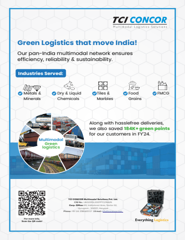Along with hasslefree deliveries,we also saved 184K+ green pointsfor our customers in FY'24.Metals &MineralsDry & LiquidChemicalsTiles &Marbles FoodGrains FMCGGreen Logistics that move India!Our pan-India multimodal network ensuresefficiency, reliability & sustainability.Industries Served:For more info,Scan the QR code!TCI CONCOR Multimodal Solutions Pvt. Ltd.CIN No.: U60231DL2007PTC216625Corp. O%u0006ce:69, Institutional Area, Sector-32,Gurugram - 122001, HaryanaPhone: +91 124 2381603-07 |E-mail:info@tciconcor.comMultimodalGreenlogistics