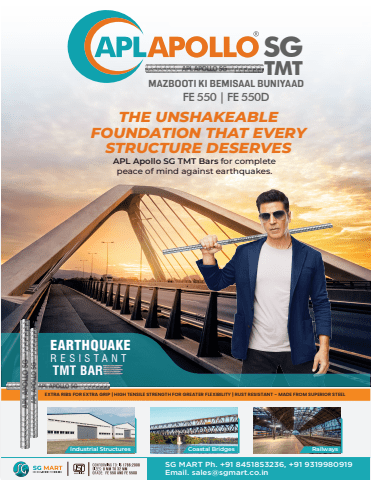 SG MART Ph. +91 8451853236, +91 9319980919Email. sales@sgmart.co.inEXTRA RIBS FOR EXTRA GRIP | HIGH TENSILE STRENGTH FOR GREATER FLEXIBILITY | RUST RESISTANT - MADE FROM SUPERIOR STEELIndustrial StructuresCoastal BridgesRailwaysEARTHQUAKERESISTANTTMT BARAPL Apollo SG TMT Bars for completepeace of mind against earthquakes.SGTMTMAZBOOTI KI BEMISAAL BUNIYAADFE 550 | FE 550DTHE UNSHAKEABLEFOUNDATION THAT EVERYSTRUCTURE DESERVES