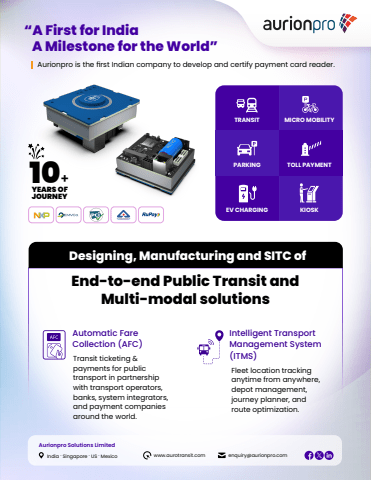 End-to-end Public Transit andMulti-modal solutionsTransit ticketing & payments for public transport in partnership with transport operators, banks, system integrators, and payment companies around the world.Intelligent TransportManagement System(ITMS)Fleet location tracking anytime from anywhere, depot management, journey planner, and route optimization.Automatic FareCollection (AFC)Designing, Manufacturing and SITC ofIndia . Singapore . US . Mexicowww.aurotransit.comenquiry@aurionpro.comAurionpro Solutions Limited%u201cA First for India A Milestone for the World%u201dAurionpro is the first Indian company to develop and certify payment card reader.TRANSITEV CHARGINGPARKINGMICRO MOBILITYKIOSKTOLL PAYMENT10+YEARS OFJOURNEY