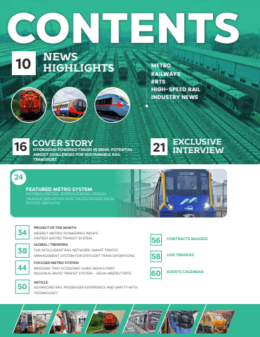 CONTENTSHYDROGEN-POWERED TRAINS IN INDIA: POTENTIAL AMIDST CHALLENGES FOR SUSTAINABLE RAIL TRANSPORTCOVER STORY16NEWS 10HIGHLIGHTSEXCLUSIVE 21INTERVIEWPROJECT OF THE MONTHMEERUT METRO: PIONEERING INDIA%u2019S FASTEST METRO TRANSIT SYSTEM34CONTRACTS BAGGED56EVENTS CALENDAR60LIVE TENDERS58FOCUSED METRO SYSTEMBRIDGING TWO ECONOMIC HUBS: INDIA%u2019S FIRST REGIONAL RAPID TRANSIT SYSTEM %u2013 DELHI-MEERUT RRTS 44ARTICLEADVANCING RAIL PASSENGER EXPERIENCE AND SAFETY WITH TECHNOLOGY 50GLOBAL / TRENDINGTHE INTELLIGENT RAIL NETWORK: SMART TRAFFIC MANAGEMENT SYSTEM FOR EFFICIENT TRAIN OPERATIONS 38FEATURED METRO SYSTEMMUMBAI METRO: EMPOWERING URBAN TRANSFORMATION AND FACILITATING REAL ESTATE GROWTH24METRORAILWAYSRRTSHIGH-SPEED RAILINDUSTRY NEWS