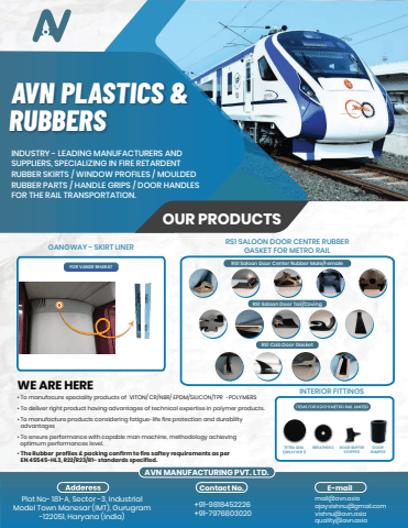%u2022 To manufacure speciality products of VITON/ CR/NBR/ EPDM/SILICON/TPR -POLYMERS%u2022 To deliver right product having advantages of technical expertise in polymer products.%u2022 To manufacture products considering fatigue-life fire protection and durability advantages%u2022 To ensure performance with capable man machine, methodology achieving%u2022 The Rubber profiles & packing confirm to fire saftey requirements as per EN 45545-HL3, R22/R23/R1- standards%u00a0specified. optimum performances level.WE ARE HEREPlot No- 181-A, Sector -3, Industrial Model Town Manesar (IMT), Gurugram -122051, Haryana (India) +91-9818452226 +91-7976803020 mail@avn.asiaajayvishnu@gmail.comvishnu@avn.asiaquality@avn.asiaAVN MANUFACTURING PVT. LTD.Contact No.E-mail AVN PLASTICS &RUBBERSINDUSTRY - LEADING MANUFACTURERS AND SUPPLIERS, SPECIALIZING IN FIRE RETARDENT RUBBER SKIRTS / WINDOW PROFILES / MOULDED RUBBER PARTS / HANDLE GRIPS / DOOR HANDLES FOR THE RAIL TRANSPORTATION.OUR PRODUCTSGANGWAY - SKIRT LINERFOR VANDE%u00a0BHARATRS1 SALOON DOOR CENTRE RUBBERGASKET FOR METRO RAILINTERIOR FITTINGSTETRA SEALBREATHER 2DOOR BUFFERSTOPPERDOORBUMPERRS1 Saloon Door Center Rubber Male/FemaleRS1 Saloon Door Tail/CovingRS1%u00a0Cab%u00a0Door%u00a0Gasket