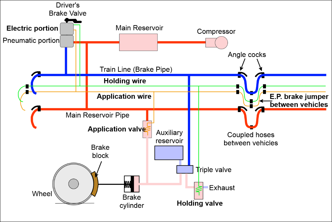 In this system, the main braking power still comes from compressed air acting on the brake cylinders, but the control of the brakes is done electrically. Instead of relying on air pressure changes to travel through the brake pipe, electrical signals are sent along the train. These signals reach electro-pneumatic valves on each vehicle, which then allow compressed air from the reservoirs to enter the brake cylinders. This makes the brakes apply and release almost instantly and at the same time across the whole train.