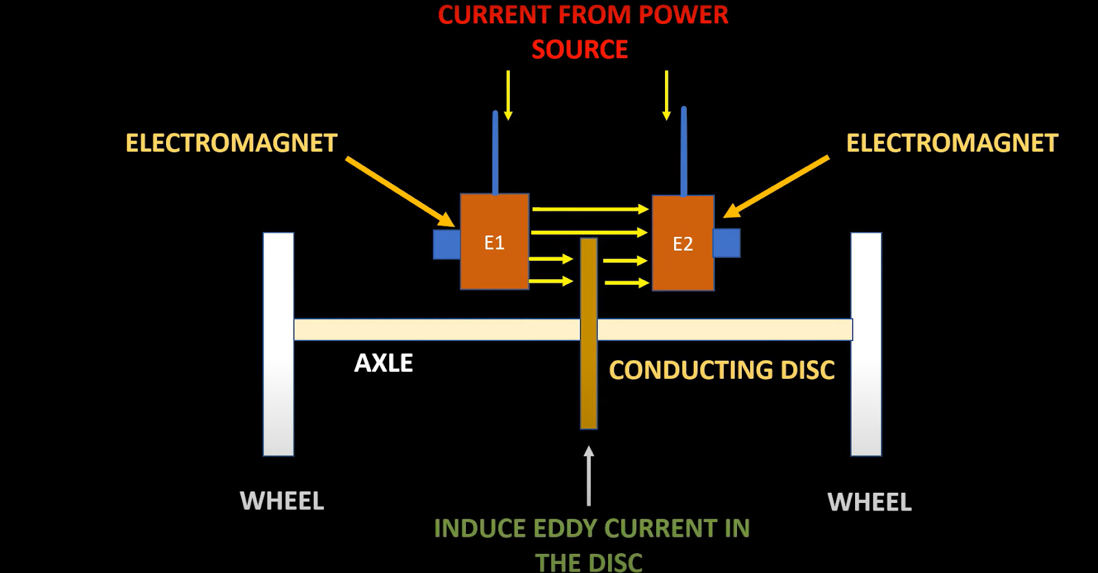 Eddy current brakes operate on the principle of electromagnetism and provide contactless braking. A conductive disc is mounted on the axle, with electromagnets positioned near it. When the driver applies the brakes, the electromagnets are energised, creating a magnetic field. As the disc rotates through this field, eddy currents are induced in the disc. These currents generate an opposing magnetic field according to Lenz’s Law and produce a resistive force that slows the train without any physical contact.