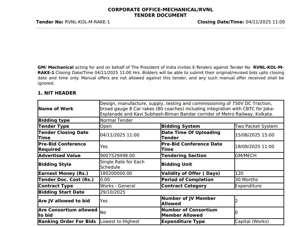 To get real-time updates on metro and railway tenders, join our WhatsApp Community: https://chat.whatsapp.com/EzkphM7r0eaGtWJXi59CLb
